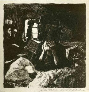 - Prent: Käthe Kollwitz 1893-1895, deze is getiteld Not, uit de weversserie (let op de garenhaspel!), Käthe Kollwitz Museum in Keulen