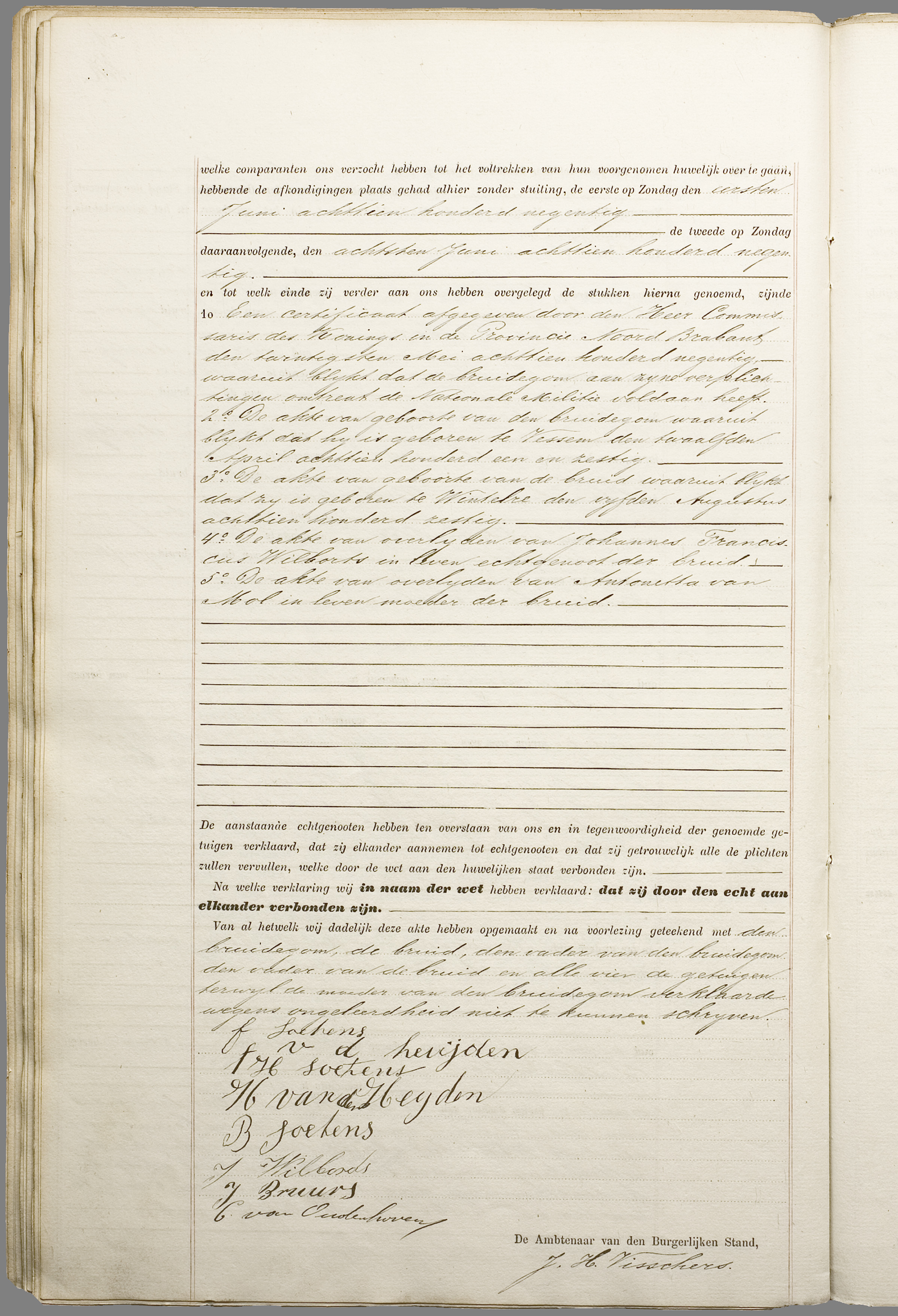 Na even speuren heb ik de meest waarschijnlijke trouwakte gevonden: de 29-jarige landbouwster Francijna van der Heijden uit Wintelre, weduwe van Wilborts, trouwt in juni 1890 met landbouwer Frederikus Soetens, ook 29 jaar,